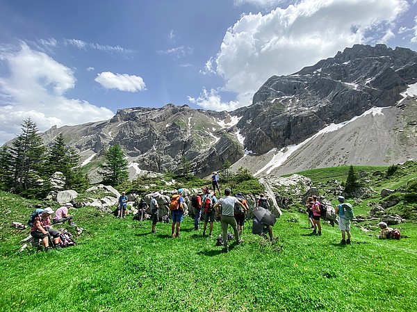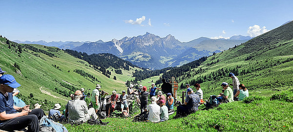 Unter dem Motto «Jetz wei mer eis jödele» machten sich 39 gut gelaunte Teilnehmende auf die Rundwanderung, den «Jodlerweg», oberhalb von St. Stephan – begleitet von grandioser Aussicht und herzerwärmenden Jodelklängen. Auf der Alp Dürrewald angekommen, tauchten wir ein in diese beeindruckende Bergwelt – getragen von den berührenden Melodien des Komponisten Ueli Moor. Eine besondere Überraschung: der Meister selbst war an diesem Tag ebenfalls unterwegs. Beim «Stii» (Stein) durften wir seinem Naturjutz (Naturjodel) lauschen und dem grandiosen Echo nachspüren – ein Hühnerhautmoment. Bereits zuvor hörten wir das Lied «e schöni Zyt», wenn auch aus der Dose – doch selbst so ging der Text an diesem Platz, hier wo dieses Lied komponiert wurde, direkt ins Herz. Weiter ging es aufwärts Richtung Grat, wo sich das Panorama weit öffnete – ein neuer Blick Richtung Wildstrubel, Adelboden und Lenk. Mit einem «Gruess a d’Lenk» stiegen wir weiter auf zum Gipfel des Flöschhore. Oben angekommen, brachte uns das Lied «Was i gspüre» zur Mittagsrast voller Dankbarkeit und Weitsicht. Vor dem Abmarsch durften wir dann noch gemeinsam mit Ueli Moor «d’Bärgwanderig» singen – und wir wussten ja nun definitiv, dass «chli jutze» (ein bisschen jauchzen oder freudig rufen) auch gesund ist. Botanisch hatte diese Wanderung ebenfalls wieder einiges zu bieten. Bereits beim Aufstieg begeisterte die Blumenvielfalt. Die Botanikerinnen und Botaniker unter uns kamen voll auf ihre Kosten. Besonders erfreulich: das Entdecken des Allermannsharnisch, der Kugelorchis, des Alpen-Berufskrauts der Gattung Asteraceae und des zahlreichen Männertreus. Der Blick zurück zeigte, wie rasch wir an Höhe verloren hatten. Zurück auf der Alp Dürrewald genossen wir zum Abschluss feinen Hobelkäse oder Meringue. Ein letzter Blick hoch zum Flöschhore und ein Naturjutz von Ueli – dann brachten uns die Busse des örtlichen Taxiunternehmens zurück nach St. Stephan brachten.