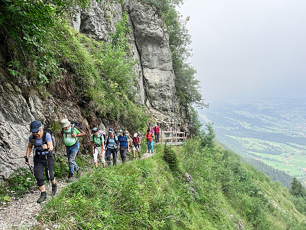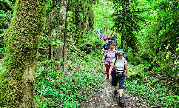 Direkt hinter den prächtigen Bauernhöfen von Röthenbach kamen wir gleich ins Schwitzen. Der Weg führte in mehreren Stufen steil «obsi» nach Hinter Stauffen und Vorder Stauffen. Unsere Mühen wurden mit einem wunderbaren Panorama auf die Berner Voralpen und Alpen belohnt. Zwischen den beiden stattlichen Höfen steht auch eine der ältesten Eichen der Schweiz. Das Alter des Baumes wird auf über 600 Jahre geschätzt. Wir wanderten nun abwärts durch den Heimeneggbaan zu einem idyllischen Picknickplatz direkt an der Rotache. Frisch gestärkt nahmen wir den Weg nach Schwarzenegg und hinunter in die Zulgschlucht unter die Füsse. Der Aufstieg nach dem Chachelischwandsteg hatte es in sich: Circa 300 steile Höhenmeter mussten erneut bis zum Ziel bewältigt werden. Bei der Bushaltestelle Buchen Schulhaus war diese abwechslungs- und aussichtsreiche Etappe zu Ende.