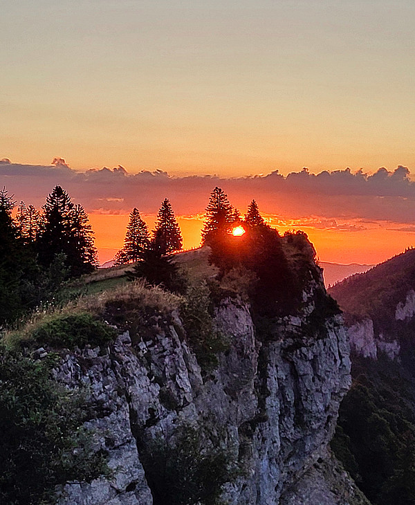 Bei warmen, sonnigen Bedingungen startete die 21-köpfige Wandergruppe um 20.00 Uhr in Tavannes. Kurz ging es durch das Dorf, dann waren wir schon in der Natur. Der Weg wurde steil. Nach neunzig schweisstreibenden Minuten erreichten wir genau zum Sonnenuntergang Le Brahon. Es war ein wunderschöner Anblick. Nach der Sonnenuntergangspause zogen wir weiter. Es wurde immer dunkler. Das helle Jurakies auf den Wegen leuchtete uns den Weg über Wertberg weiter bis zur Cabanne La Rochette, wo um 23.00 Uhr Halt gemacht wurde. Der Vollmond schaute rot hinter dem Wald hervor. Diese stärkende Pause war nötig, denn der Weg war noch lang. Kilometer um Kilometer wanderten wir nach der Pause auf über 1250 m ü. M. Der Vollmond stieg höher am Himmel und wurde allmählich gelb, einzelne harmlose Wolken sorgten für mystische Stimmung. Sogar Sternschnuppen konnte man vereinzelt sehen. Es war zauberhaft. Plötzlich, kurz vor dem Gedenkstein von Willi Ritschard, ertönte Musik: ein Schwyzerörgeli. Zudem brannte in der schönen Feuerstelle beim Gedenkstein ein loderndes Feuer. Alles lief wie geplant. Nach der gemütlichen Pause mit Gesang zog die Gruppe weiter zum Sonnenaufgang auf der Wandfluh, wo sich wieder ein zauberhafter Anblick bot. Es folgte der Abstieg zum Bergrestaurant Bettlachstock. Dort wartete ein Frühstücksbuffet par excellence. Ein Dank gilt Céline und Marc, die extra so früh am Morgen ihr Restaurant geöffnet haben. Die letzten anderthalb Stunden zum Bahnhof Bettlach gingen nochmal etwas in die Beine. Als die 600 Höhenmeter Abstieg geschafft waren, konnte man die Glückshormone spüren. Am Ende waren fast 14 Stunden, weit über 50 000 Schritte, seit dem Aufbruch in Tavannes vergangen. Es war für alle ein unvergessliches Erlebnis.