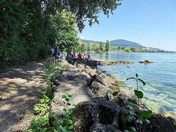An einem hochsommerlichen Tag mussten 23 Teilnehmenden unter der Leitung von Hansruedi Kull und Guy Schneider mit grosser Hitze rechnen. Nach der Fahrt mit dem Tram Littorail von Neuenburg nach Boudry begaben wir uns zuallererst zum Bistro «Code Bar». Nach der ersten Stärkung stiegen wir durchs malerische Dorf bis zum Schloss hinauf. Vorwiegend im Wald wanderten wir dann dem Fluss Areuse entlang bis zu dessen Mündung in den Neuenburgersee. Dort gab es eine schattige Trinkpause. Von da an ging es vorwiegend wieder durch Wald dem See entlang bis nach Auvernier. Vor dem Dorf genossen wir das mitgenommene Picknick. Es reichte noch gut zu einer Besichtigung des schönen Dorfes mit seinen alten stattlichen Häusern und dem Schloss. Inzwischen war es im Dorf besonders heiss geworden. Die meisten erfrischten sich mit einem kalten Getränk oder einer Glace in einem Restaurant nahe dem Bahnhof des Littorail.