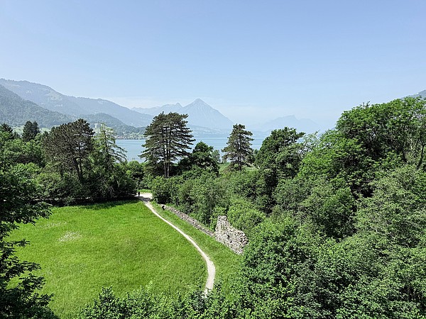 Genussvoll startete der Tag beim Kaffee im Marina, direkt bei der Schiffsanlegestelle Interlaken Ost. Die Gruppe war vergnügt und zufrieden. Auch das Wetter war bestens, sonnig und schön warm. Gemütlich starteten wir durch den Englischen Garten und folgten dann auf der rechten Seite der Aare dem Kanal nach Unterseen. Nach den schönen Städtli waren wir schon ganz in der Natur. Bei der Ruine Weissenburg, welche es wirklich zu besuchen lohnt, machten wir Pause. Die Mauern wirken majestätisch. Interessant sind auch die Infotafeln, die mehr über die Geschichte erzählen. Die Aussicht von oben war phänomenal. Die Stege direkt am oder teils sogar auf dem Wasser der Auenlandschaft des Schutzgebietes waren gut zu begehen und führten uns zum Neuhaus am See. Dort, bei schönem Ambiente und sehr gutem Service, genossen wir unser Mittagessen. Sogar für ein kurzes Bad im See reichte die Zeit noch, bevor wir weitergingen. Nach einem kurzen Anstieg führte uns der Weg circa 50 Meter über dem Seespiegel durch einen lichten Wald. Wir genossen schöne Blicke zum See und den umliegenden Bergen. Bei Sundlauenen kamen wir pünktlich zum Schiffsteg und konnten auf dem Raddampfer Blüemlisalp die Fahrt nach Thun geniessen. Schön war’s!