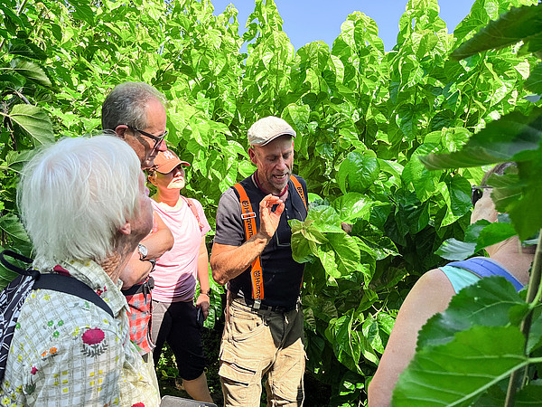 Gefräßig sind sie – die Tausenden Seidenraupen, die kurz davor stehen, sich in ihren Kokon einzuspinnen. Im Untergeschoss des Hauses von Bettina Clavadetscher und Ueli Ramseier auf dem Bergfeldhof in Hinterkappelen fressen die Raupen unablässig und praktisch rund um die Uhr die ebenso unablässig herbeigeführten Blätter des weissen Maulbeerbaums. Zwei Wandergruppen der Berner Wanderwege kamen in den Genuss einer exklusiven Führung durch die Seidenraupenzucht auf dem Bergfeldhof. Ueli Ramseier zeigte zuerst die eindrückliche Maulbeerplantage oberhalb von Hinterkappelen und erzählte uns, wie er als Pionier die Seidenraupenzucht wieder in die Schweiz brachte und mit welchem umfangreichen Wissen, welch grosser Arbeit und Umsichtigkeit ein solches Projekt gelingen kann. Im Anschluss an die Führung durch die Anlage erfuhren wir im Bergfeldhof, wie aus den gigantischen Mengen an Maulbeerblättern Futter für die gefrässigen Raupen wird, wie diese sich wiederum verpuppen und die begehrten Seidenkokons bilden. Und schliesslich durften wir noch einen kurzen Blick aus der Distanz in die «Stube» der Raupen werfen, die sich zuverlässig und schnell durch ihre Larvenphasen fressen. Eindrücklich ist vor allem auch mit welcher Leidenschaft und Hingabe Bettina und Ueli sich dieser grossen Aufgabe widmen. Und schliesslich konnten wir gar noch edle Produkte bestaunen oder kaufen, die aus der uralten Kunst der Seidengewinnung oder einfach aus den Maulbeerbäumen entstanden sind: Seidentücher, Seifen, Schnaps, Tee, Eistee und mehr. Ja, und gewandert sind wir natürlich auch noch. Von Hinterkappelen aus über den Wohlenberg hinunter nach Wohlen, über die Wohleibrügg und den kurzen, aber anstrengenden Chatzestyg hinauf nach Frauenkappelen, wo zweimal ein schöner Wanderhalbtag und ein äusserst interessanter Besuch der Seidenraupenzucht ihren Abschluss fanden: einmal am Mittag für die erste Gruppe und einmal am Abend für die zweite Gruppe. Und das alles bei schönstem Spätsommerwetter.