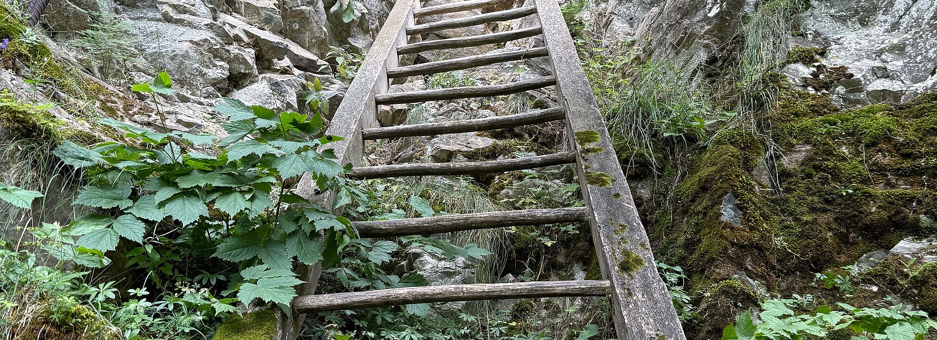Wir lassen Leukerbad hinter uns und wandern auf dem alten Handelspfad Richtung Albinen. Bis in die 50er-Jahre war dies die einzige Verbindung zwischen den beiden Orten. Nach etwa 50 Minuten treffen wir auf eine Felswand, die mittels acht Leitern überwunden werden kann. Der Weg ist spektakulär! Diese herausfordernde Stelle kann aber auch auf einem Wanderweg umgangen werden. Ab Flaschen wird der Weg einfacher und über Albinen erreichen wir Guttet. Nun wandern wir abwärts zur Hohen Brücke und durch die Felsensteppe nach Turtmann.